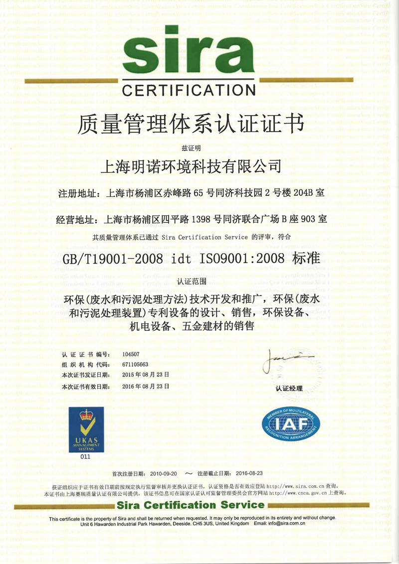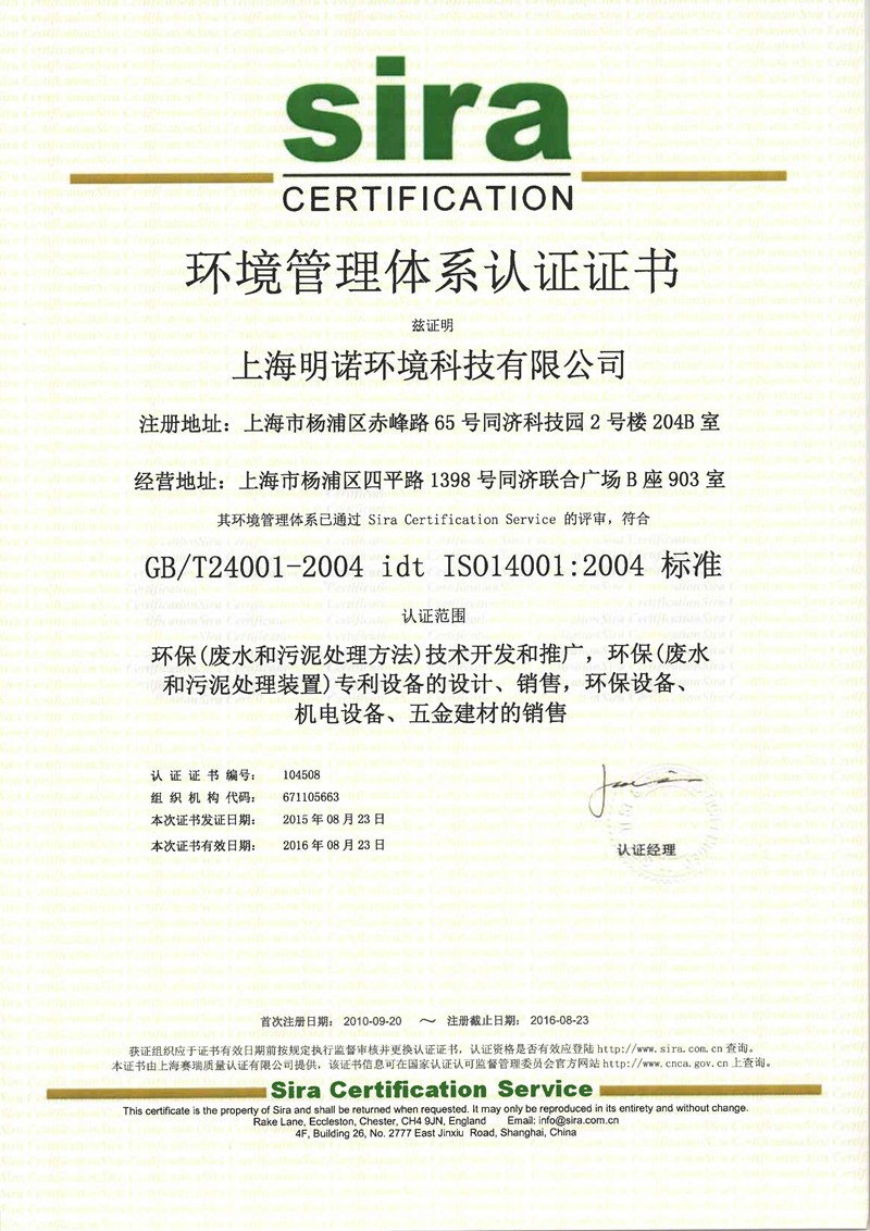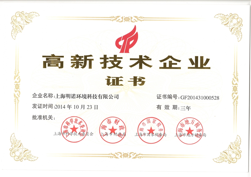 明諾環(huán)境被認(rèn)定為“國(guó)家級(jí)高新技術(shù)企業(yè)”,并受到國(guó)家科技部創(chuàng)新基金支持。公司已經(jīng)通過(guò)ISO9001:2008質(zhì)量管理體系認(rèn)證和ISO14001:2004環(huán)境管理體系認(rèn)證。