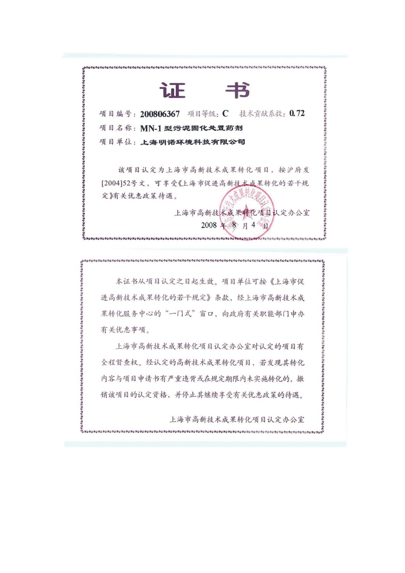上海市高新技術(shù)成果轉(zhuǎn)化項(xiàng)目證書(shū)