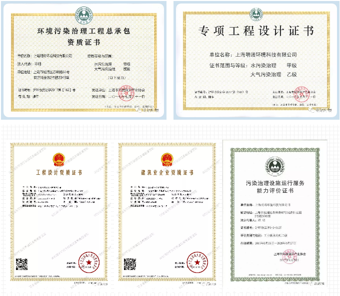 通過不懈努力明諾環(huán)境獲得了一系列環(huán)保領(lǐng)域資質(zhì)證書,包括環(huán)境工程設(shè)計(jì)專項(xiàng)(水污染防治工程)乙級(jí)證書、環(huán)保工程專業(yè)承包三級(jí)證書、環(huán)境污染治理工程總承包資質(zhì)證書、專項(xiàng)工程設(shè)計(jì)證書水污染治理甲級(jí)、大氣污染治理乙級(jí)證書和污染治理設(shè)施運(yùn)行服務(wù)能力評(píng)價(jià)證書,同時(shí)成為上海市環(huán)境保護(hù)產(chǎn)業(yè)協(xié)會(huì)會(huì)員單位。