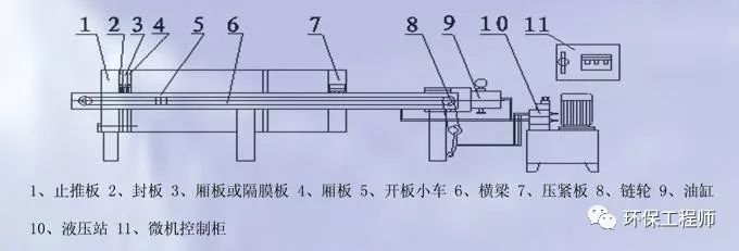 板框壓濾機(jī)由壓濾機(jī)濾板、液壓系統(tǒng)、壓濾機(jī)框、濾板傳輸系統(tǒng)和電氣系統(tǒng)等五大部分組成。結(jié)構(gòu)如圖所示: