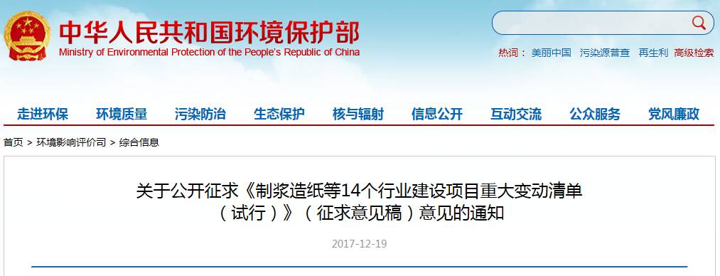 關(guān)于公開(kāi)征求《制漿造紙等14個(gè)行業(yè)建設(shè)項(xiàng)目重大變動(dòng)清單(試行)》