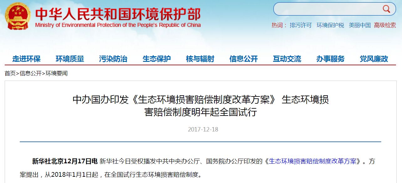 《改革方案》規(guī)定,從2018年1月1日起在全國試行生態(tài)環(huán)境損害賠償制度。
