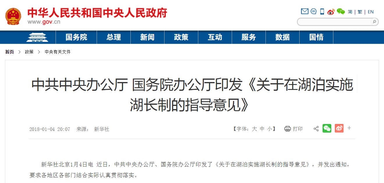 1月4日,在“河長制”推出一年后,中辦、國辦印發(fā)了《關(guān)于在湖泊實施湖長制的指導(dǎo)意見》,要求各地在2018年年底前全面建成湖長制。