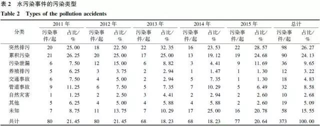 表1 中水污染數(shù)據(jù)均來(lái)自影響力較大的報(bào)刊資料、互聯(lián)網(wǎng)報(bào)道以及政府文件,網(wǎng)絡(luò)的普及和公眾維權(quán)意識(shí)的提高大大減少了分析誤差,即必然存在的小型未知水污染事件等??傮w來(lái)說(shuō),該數(shù)據(jù)統(tǒng)計(jì)結(jié)果可以達(dá)到對(duì)2011—2015 年水污染事件分析的要求。
