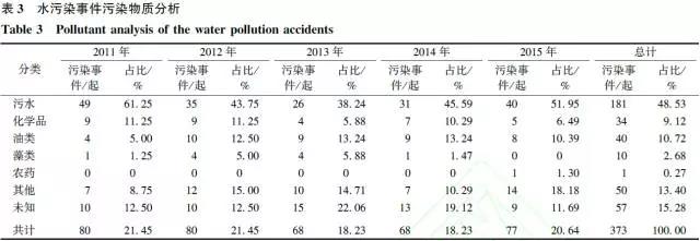 表3 顯示,按污染物質(zhì)分類(lèi),在373 起事件中,污水、化學(xué)品、油類(lèi)分別為181、34 和40 起,共計(jì)255 起,占68.37%。其中,發(fā)生次數(shù)最多的污水事件比例為48.53%,2011 年最高,占全年污染物質(zhì)事件的61.25%,2013 年最低,仍達(dá)38.24%,可以推斷水體污染的最大污染源是污水,主要來(lái)自于一些企業(yè)的生產(chǎn)廢水、農(nóng)業(yè)廢水及居民生活污水的違規(guī)排放,此外,暴雨沖刷使含污雨水及其他廢水直接排入水體也是水體污染的原因之一 ,故加大對(duì)污水的監(jiān)管力度和掌握高效的污水處理措施具有重要意義。