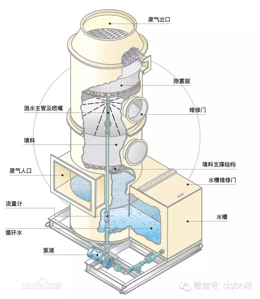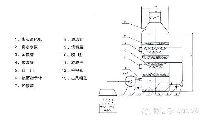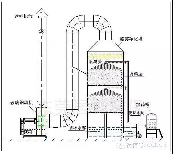 酸霧廢氣由風(fēng)管引入凈化塔,經(jīng)過(guò)填料層,廢氣與氫氧化鈉吸收液進(jìn)行氣液兩相充分接觸吸收中和反應(yīng),酸霧廢氣經(jīng)過(guò)凈化后,再經(jīng)除霧板脫水除霧后由風(fēng)機(jī)排入大氣。吸收液在塔底經(jīng)水泵增壓后在塔頂噴淋而下,最后回流至塔底循環(huán)使用。凈化后的酸霧廢氣達(dá)到廣東省地方排放標(biāo)準(zhǔn)的排放要求,低于國(guó)家排放標(biāo)準(zhǔn)。