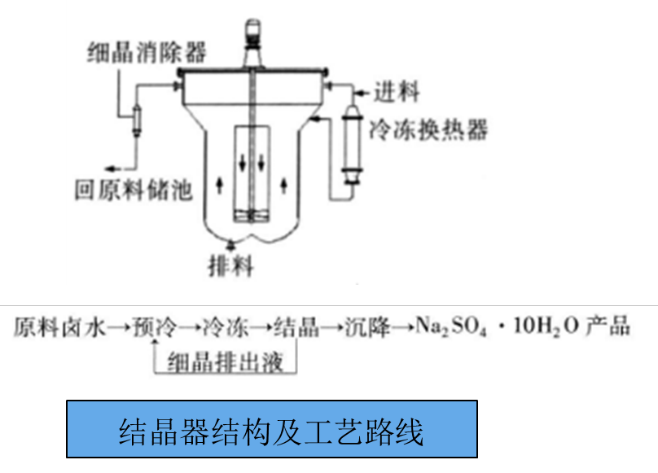 結(jié)晶工藝:系統(tǒng)來料為一定含量的硫酸鈉溶液,采用冷凍結(jié)晶方式將其中硫酸鈉以Na2SO4·10H2O的形式取出,結(jié)晶后濃度較低的母液返回前段溶解工序重新參與溶解、結(jié)晶。